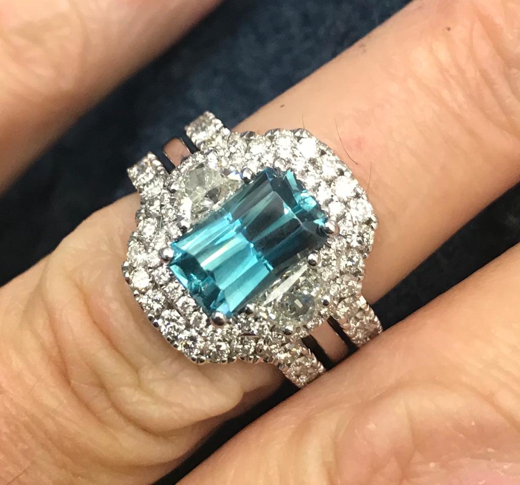 Our client came to us with a simple yet striking request: something bold, something blue. Inspired by her vision, we created this bespoke ring featuring a vivid emerald-cut blue zircon at its heart, flanked by brilliant diamonds and encircled in a sparkling halo. The result is a statement piece that radiates confidence and individuality—designed to turn heads and tell a story as unique as the woman who wears it.