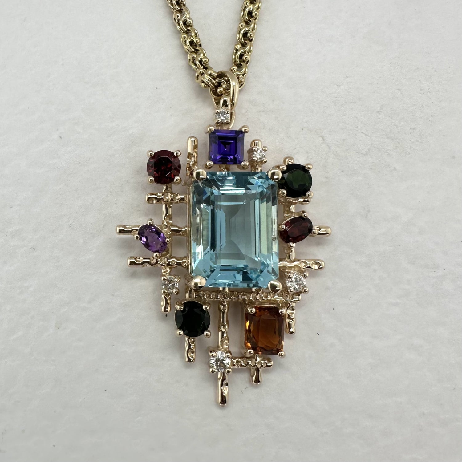 Our client brought us an eclectic collection of loose gemstones, each with its own story and sentiment. With creative freedom and a touch of artistic flair, we transformed them into this one-of-a-kind pendant—a striking composition anchored by an emerald-cut aquamarine and framed with vibrant accents of garnet, amethyst, tourmaline, citrine, and diamond. Set in warm gold, this piece is a wearable work of art—abstract, expressive, and deeply personal.