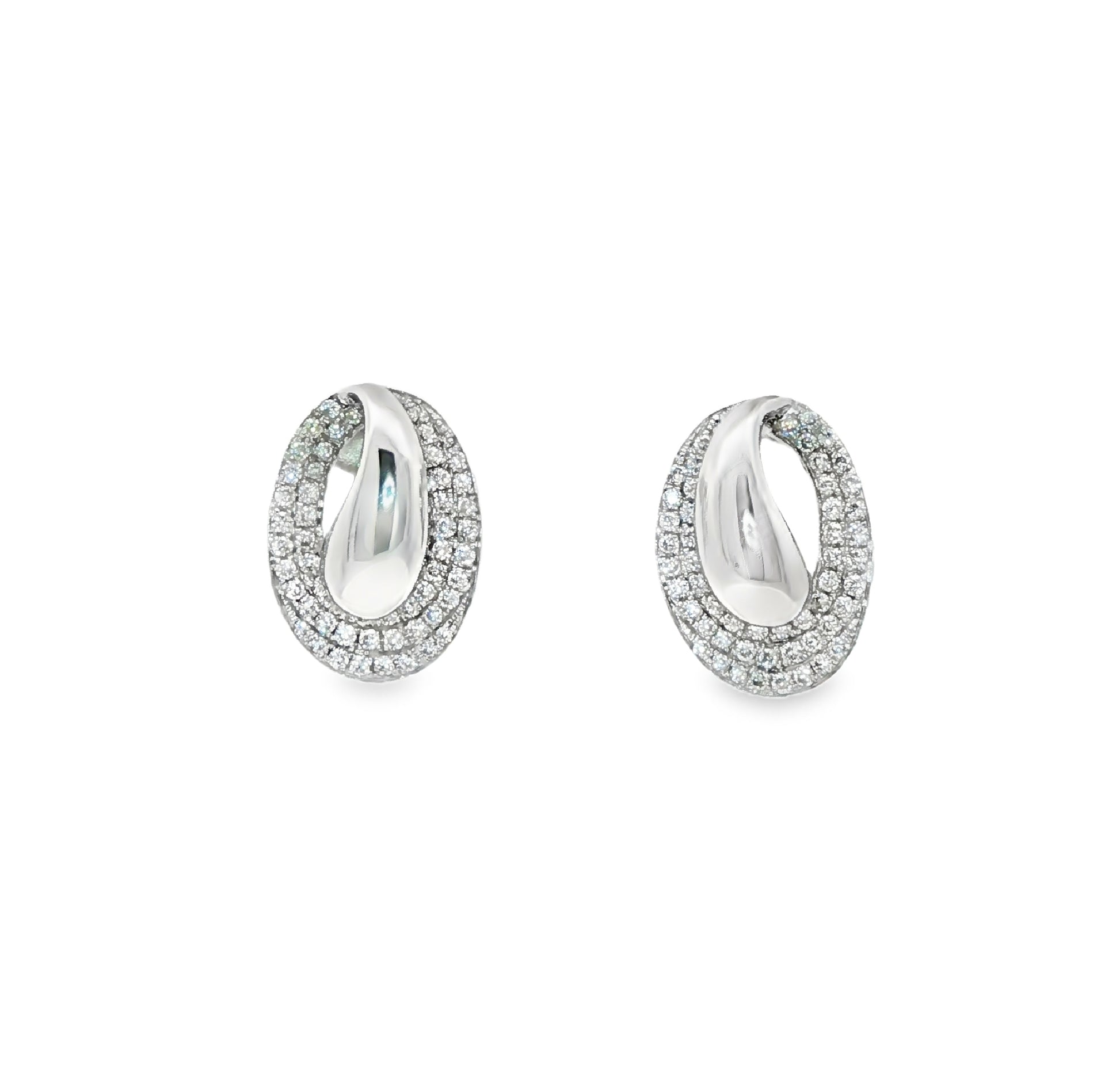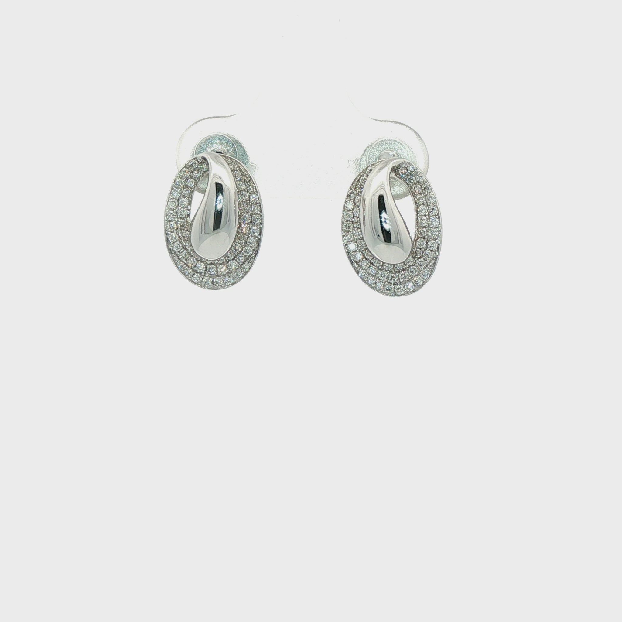 18ct white gold diamond set oval shaped studs. Set with 108 small round brilliant cut diamonds in a pave setting.