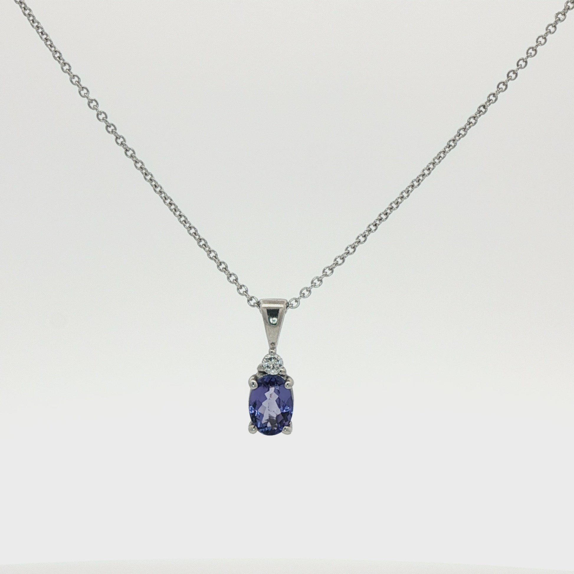 One 9ct white gold oval tanzanite and diamond pendant. Comprising of one oval brilliant cut tanzanite set in a four claw setting topped with a round brilliant cut diamond weighing 0.03ct. Plain polished fixed bail.
