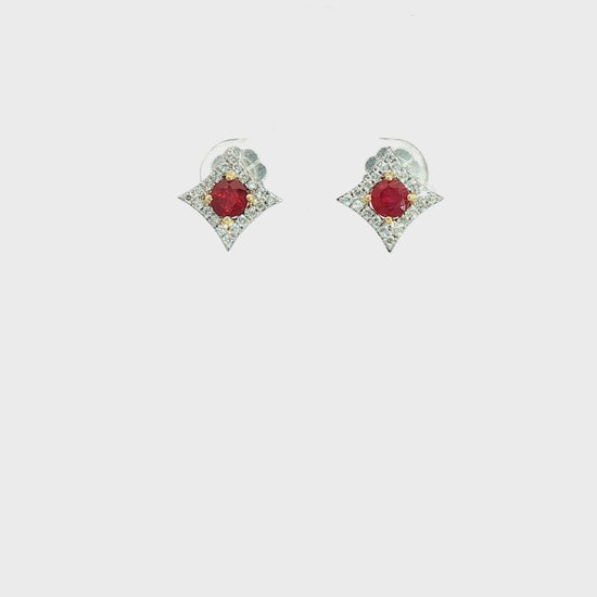 Comprising of a 'diamond shaped' cluster. One central round faceted ruby, setting. Surround, set with twenty small round brilliant cut diamonds. Post & butterfly fittings.