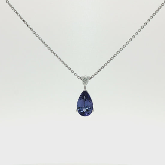 18ct White gold tanzanite and diamond pear drop pendant. Comprising of a pear shaped tanzanite, set at the bottom in a three claw setting, measuring approximately. One pear shaped diamond inverted, set to the top in a three claw setting. Attached to a 18ct white gold, eighteen inch trace chain. Adjustment loops at seventeen inch and sixteen inch intervals. secured with a lobster clasp. Total weight of Tanzanite 1.93ct and diamond 0.15ct.