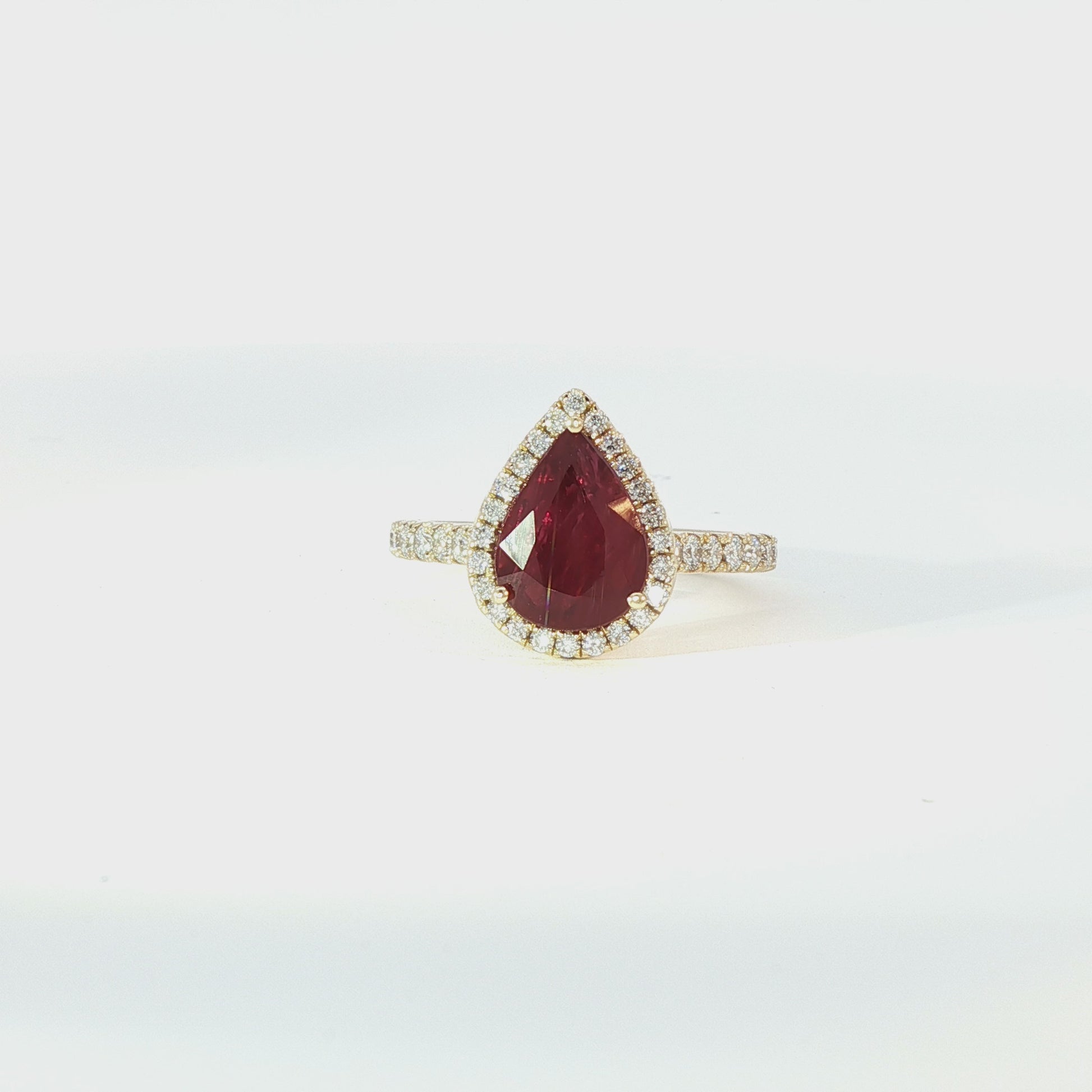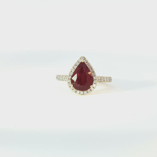 18ct yellow gold pear cut ruby and brilliant cut diamond halo ring.