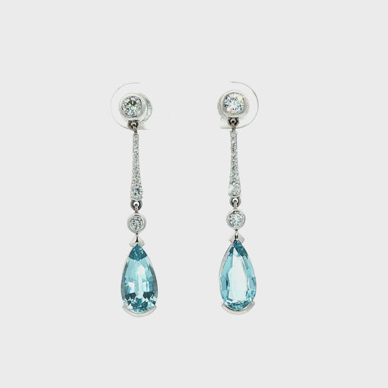 18ct white gold brilliant cut diamond and faceted pear cut aquamarine drop earrings.