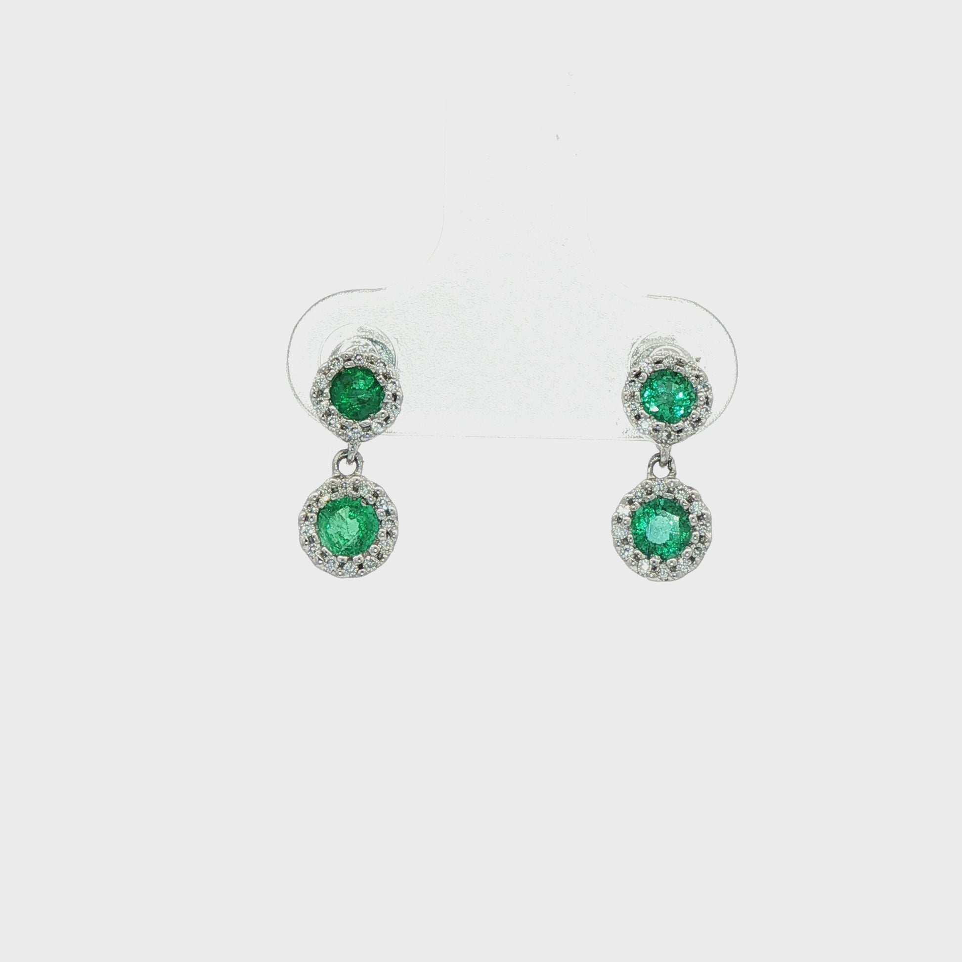 9ct White gold diamond and emerald round halo double drop earrings. Comprising of two round cut emeralds with a fine claw set surround of small round brilliant cut diamonds, post and butterfly fittings.