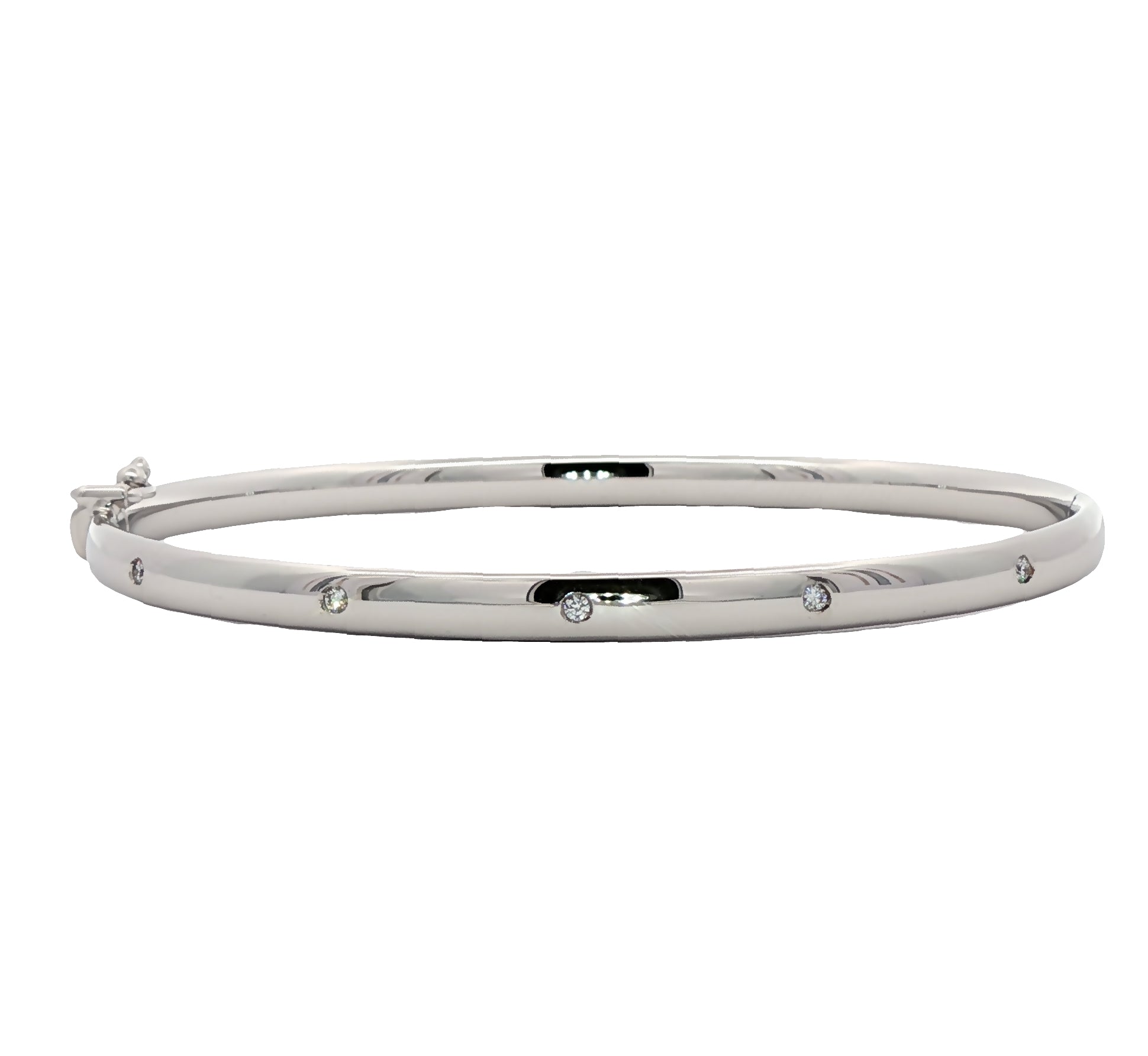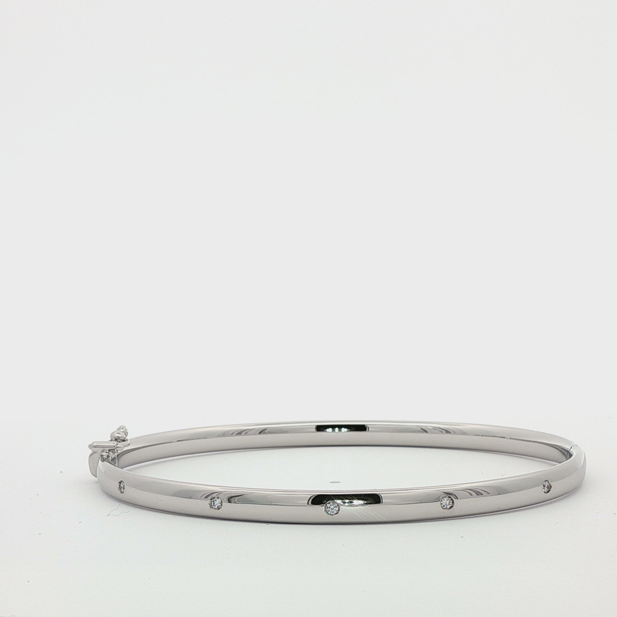 9ct White gold hollow bangle set with five brilliant cut diamonds. Comprising of a hollow oval hinged bangle, set with five round brilliant cut diamonds secured with box snap fastener and figure of eight clasp.