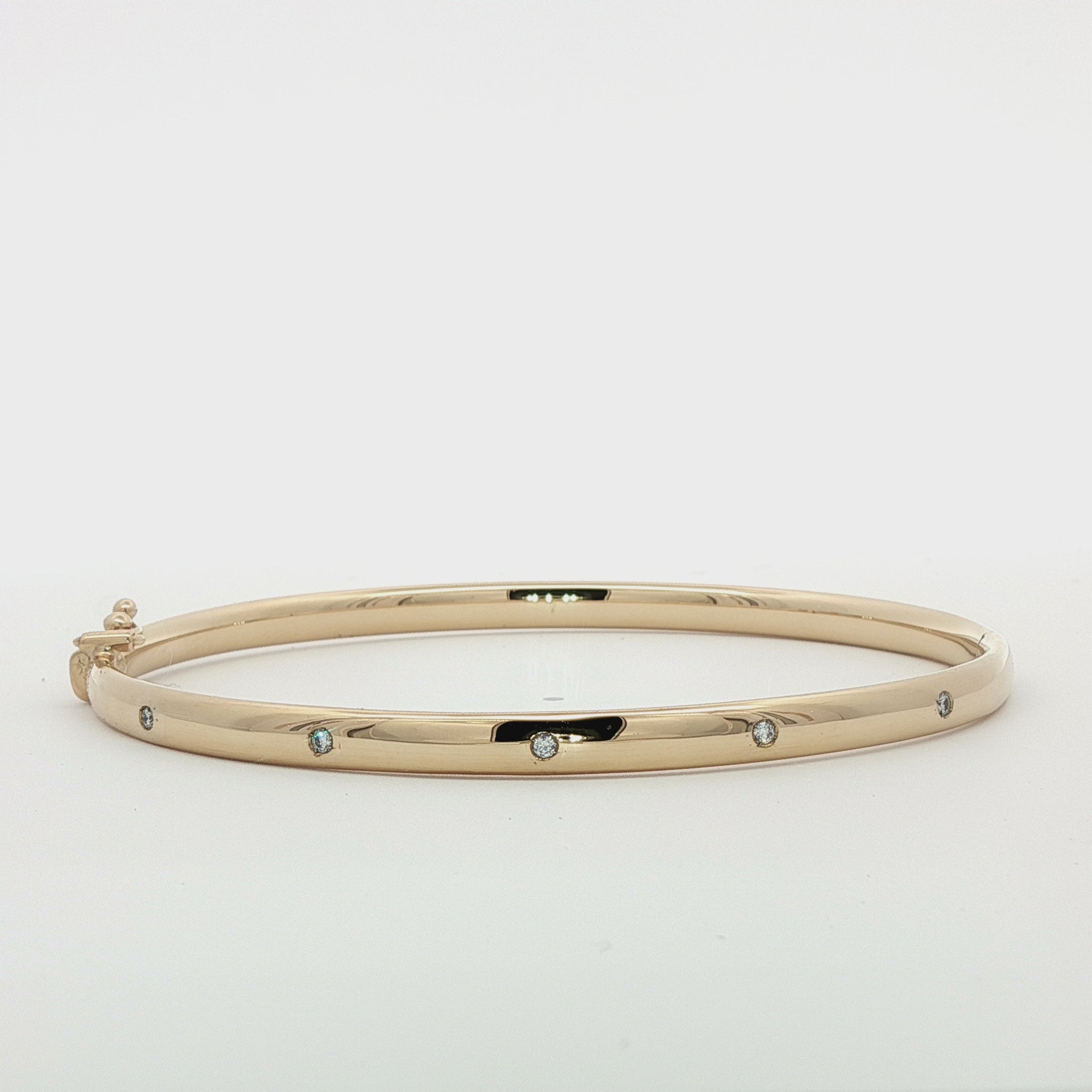 9ct yellow gold hollow bangle set with five brilliant cut diamonds comprising of hollow oval hinged bangle, set with five round brilliant cut diamonds. Secured with box snap fastener and figure of eight clasp.