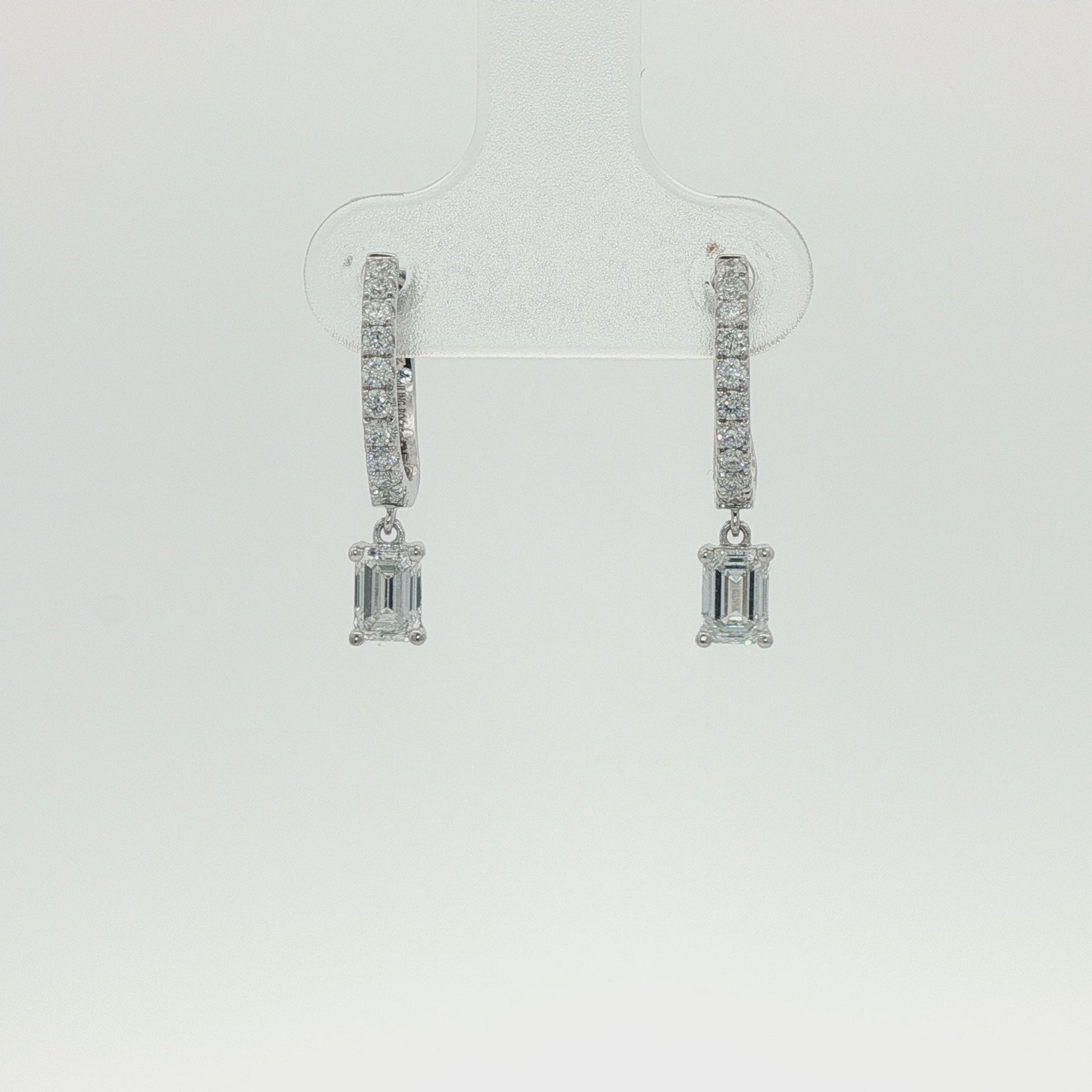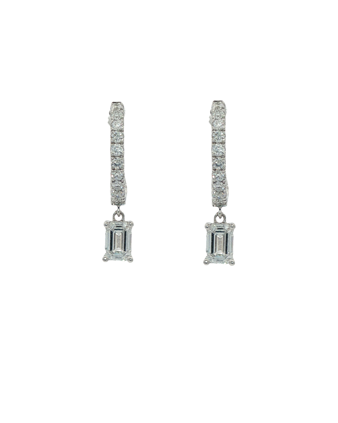 Comprising of diamond set huggie to top with emerald cut diamond drop in claw setting. Post & butterfly fittings.