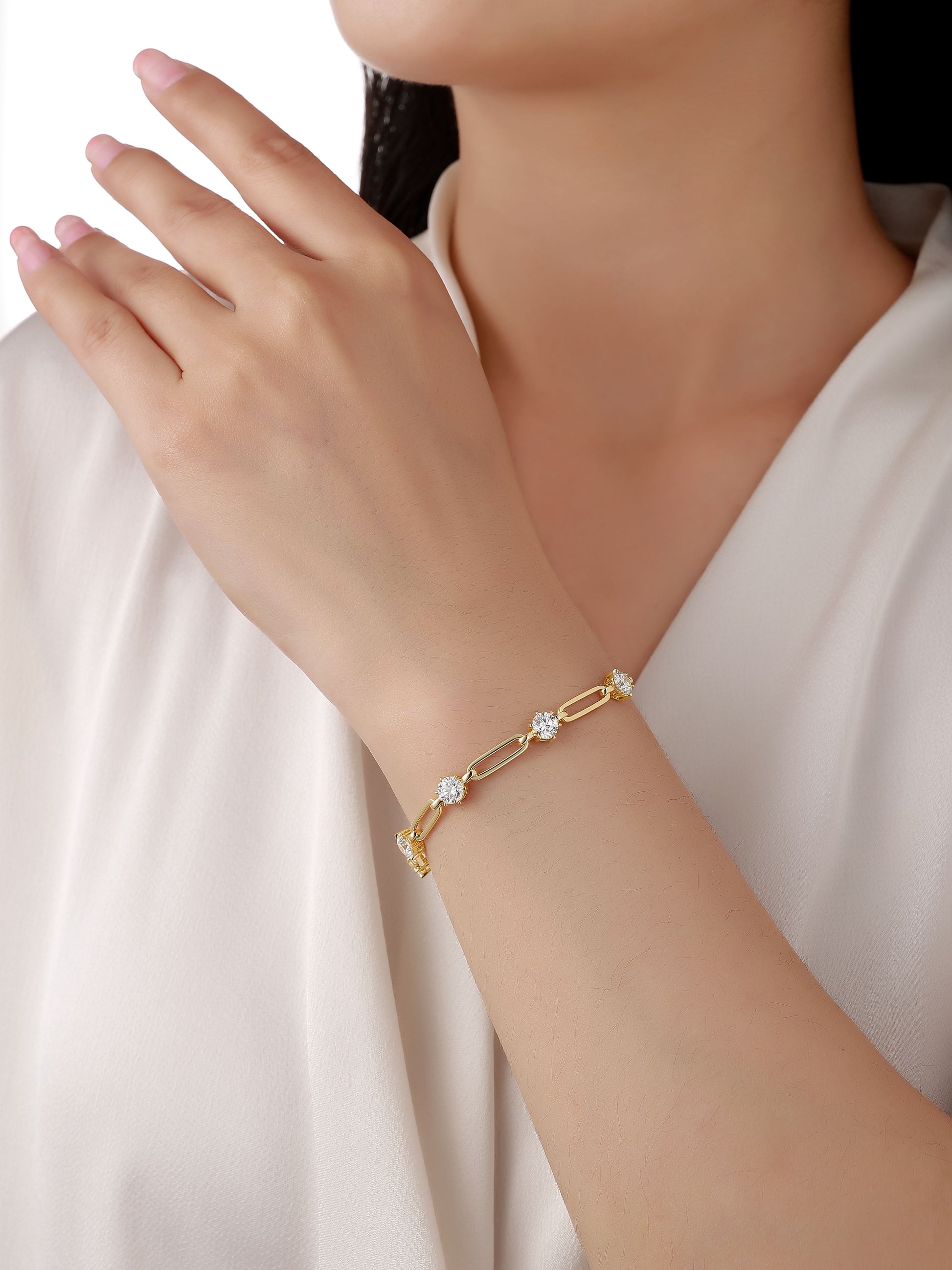 Lab grown 9ct yellow gold brilliant cut lab grown diamond in six claw setting and paper- link bracelet with alternating links and parrot clasp fastener.