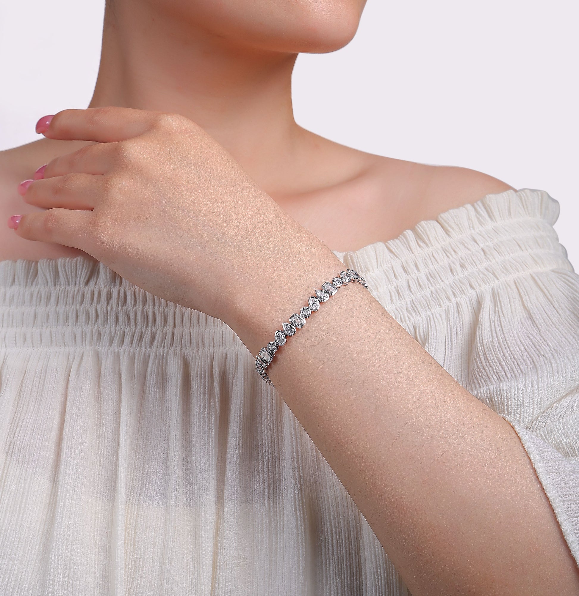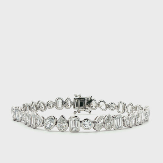 Lab Grown: 9ct white gold multi cut lab grown diamond 'Fancy Jazz' bracelet, (emerald-pear-oval & brilliant cuts), in rubover settings. Box snap fastener with double figure of eight safety clasps.