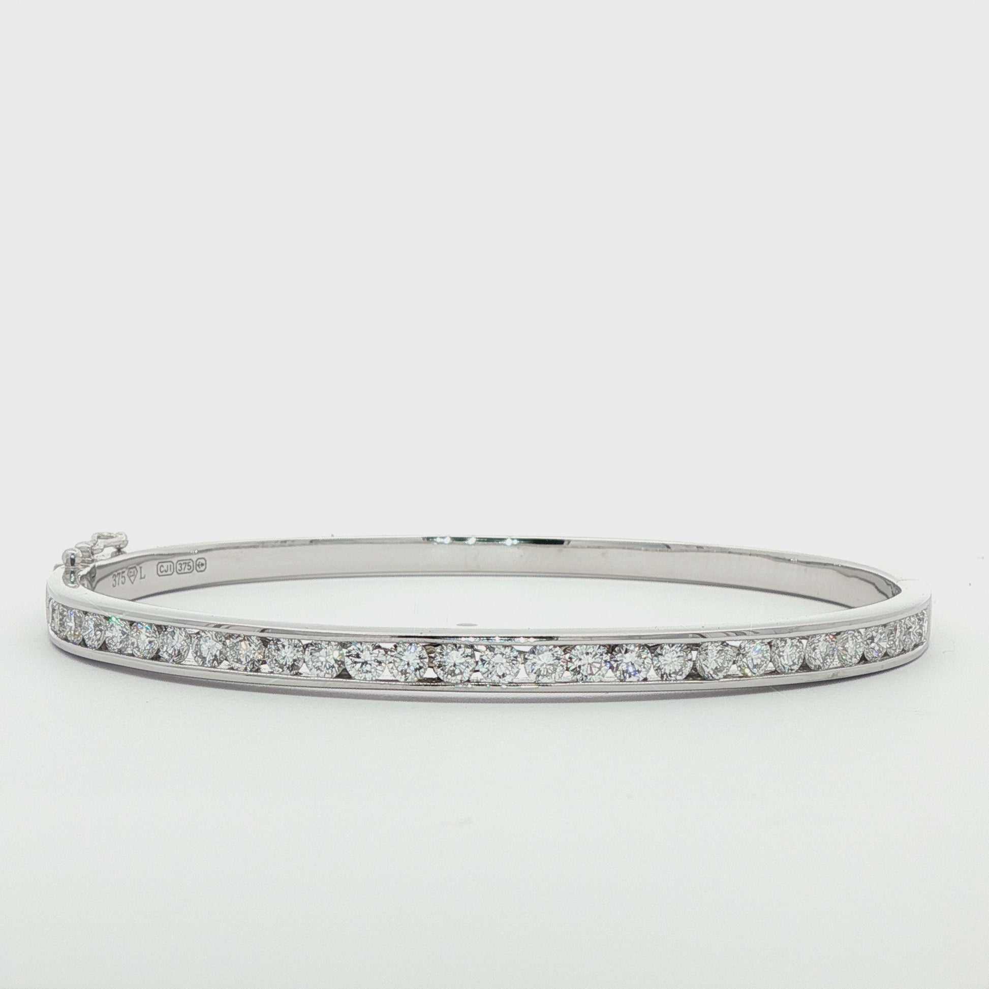 LAB GROWN: 9ct white gold round brilliant cut diamond set oval hinged bangle. Comprising of twenty nine round brilliant cut diamonds in a channel setting. Concealed box snap fastener with figure of eight safety clasp.