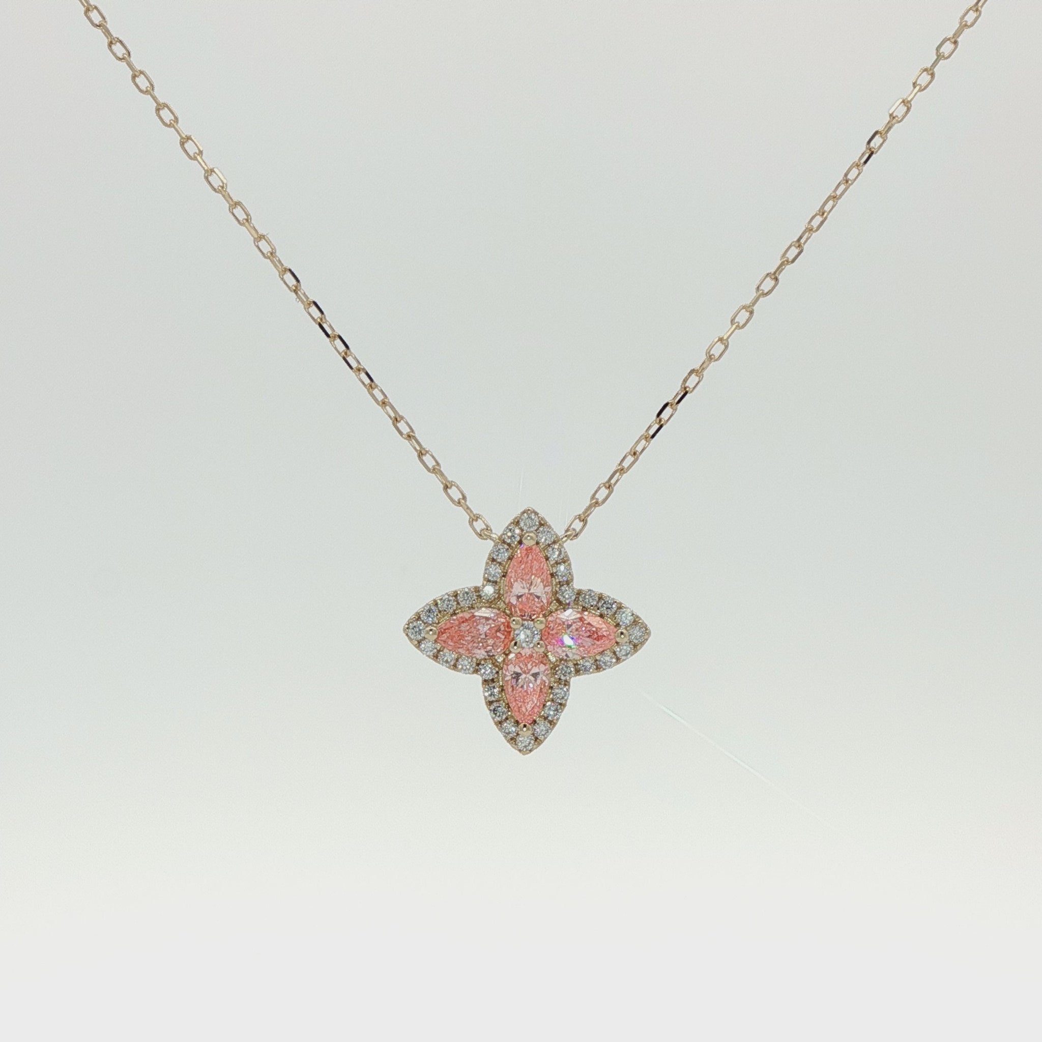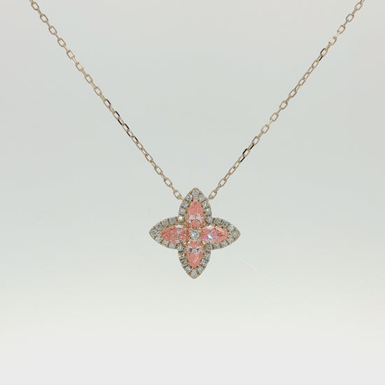 Comprising of four pink pear cut lab grown diamonds forming cross shape to centre with white small lab grown brilliant cut diamond surround & one to centre, in fine micro claw setting. Attached to fine diamond cut trace link chain.