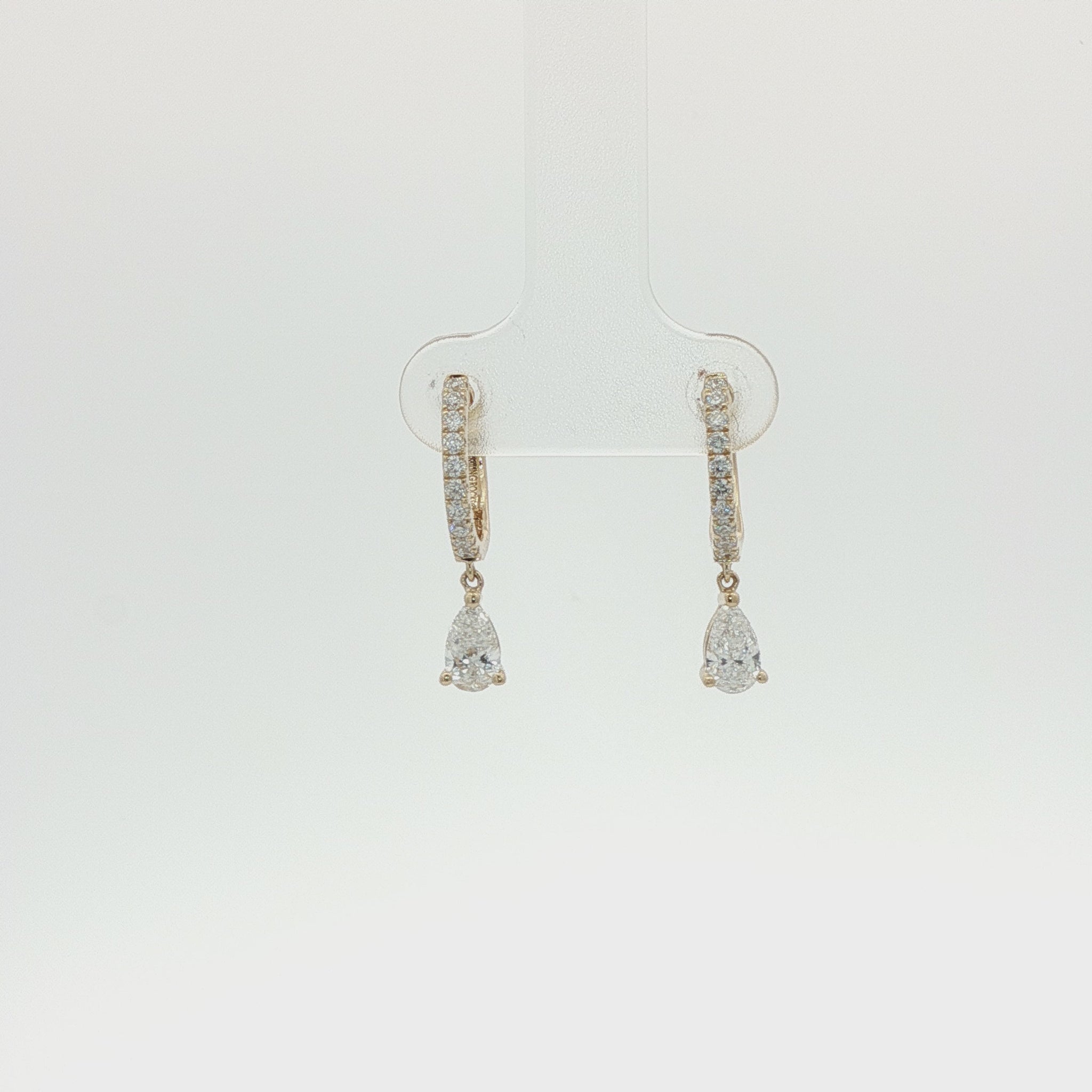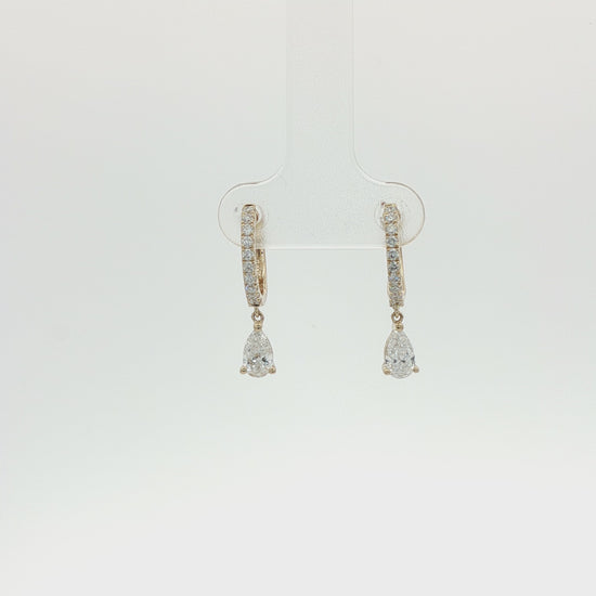 Comprising of diamond set huggie to top with pear cut diamond drop in claw setting. Post & butterfly fittings.