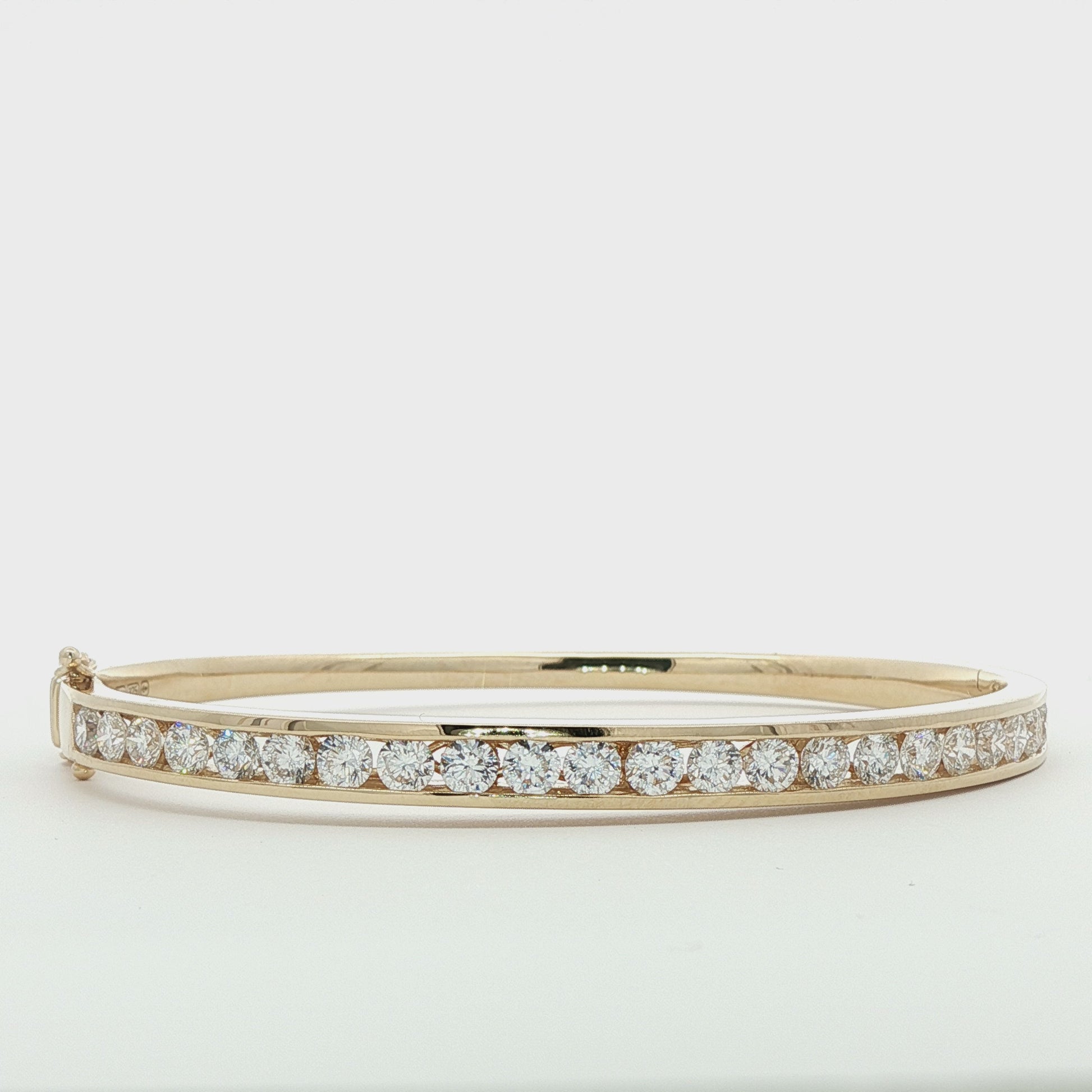 LAB GROWN: 9ct yellow gold round brilliant cut diamond set oval hinged bangle. Comprising of twenty three round brilliant cut diamonds in a channel setting. Total diamond weight 3.00ct, Colour E-F and Clarity VS-VVS. Concealed box snap fastener with fig. 8 safety clasp.