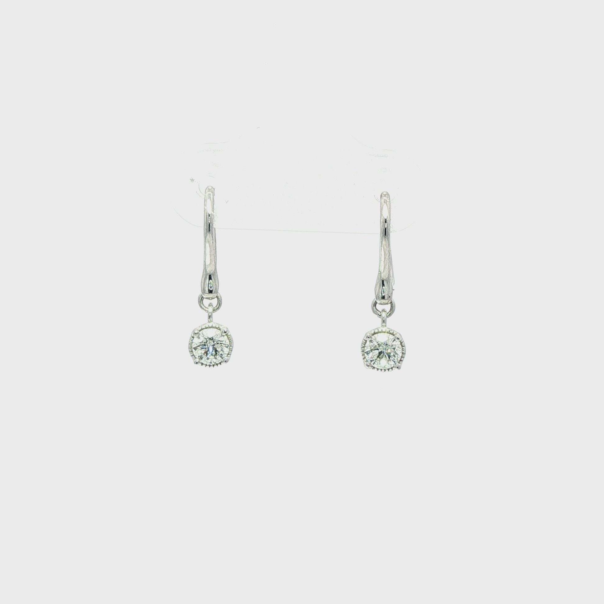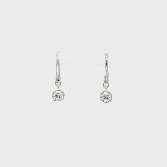 One pair of 9ct white gold round brilliant cut illusion set drop earrings. Comprising of one round brilliant cut diamond in each drop each mounted in 9ct white gold four claw illusion setting.