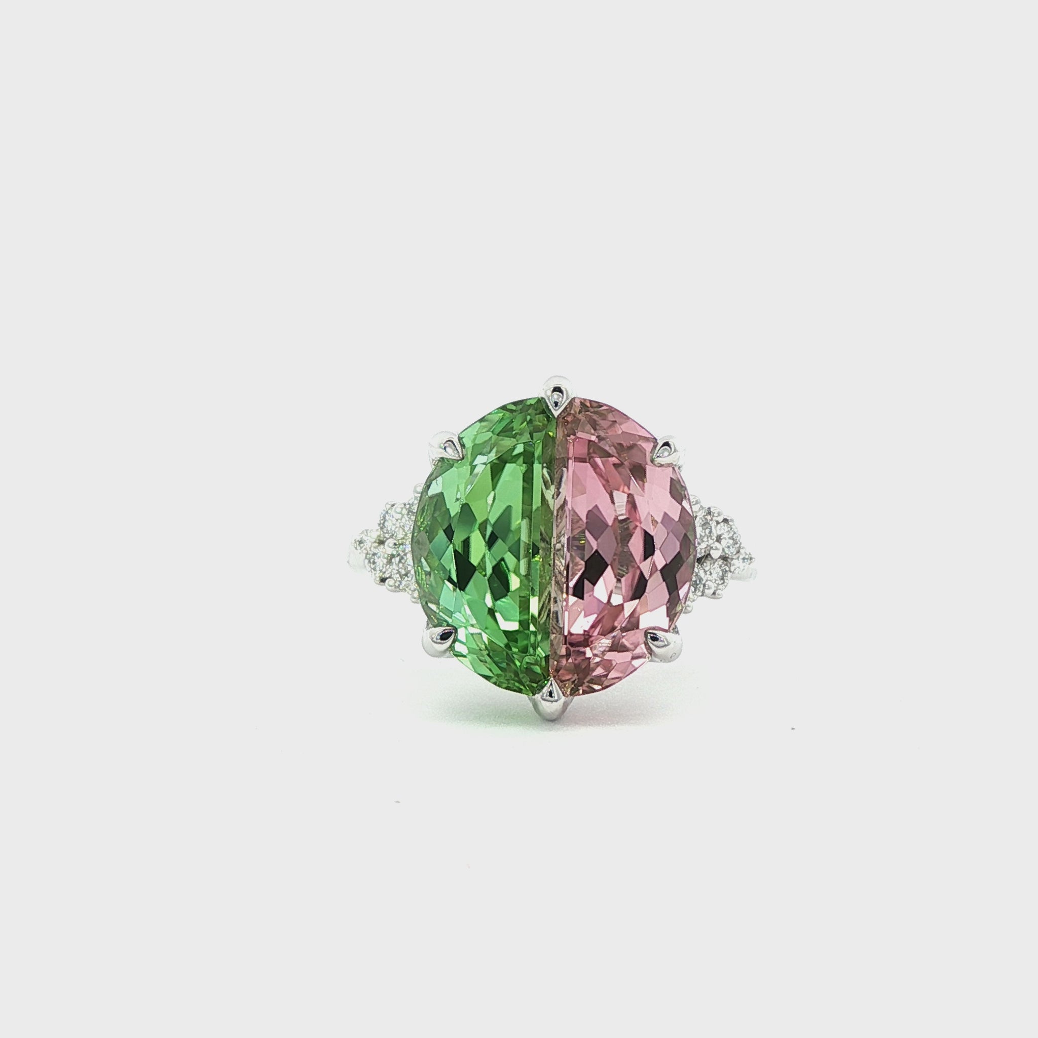 Unique: Bespoke platinum pink-green tourmaline and diamond dress ring.