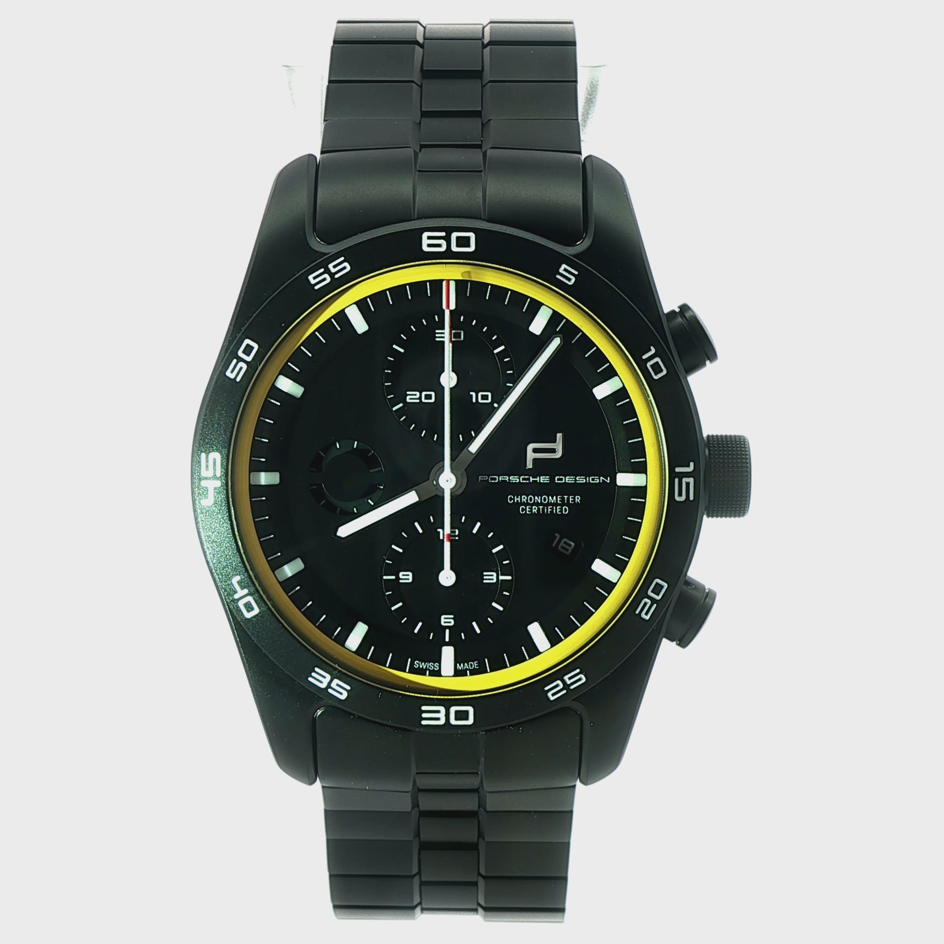 One pre owned black titanium 'Porsche Design' 1911 chronograph 'Custom Built' bracelet watch. Comprising of a black titanium timer bezel. Matt white 'performance' hand with red tip. Black dial. Yellow chapter ring to edge of dial. Black titanium linked bracelet with safety folding clasp. Exhibition Sapphire crystal case-back with Porsche design icon winding rotor. Self winding chronograph flyback movement.