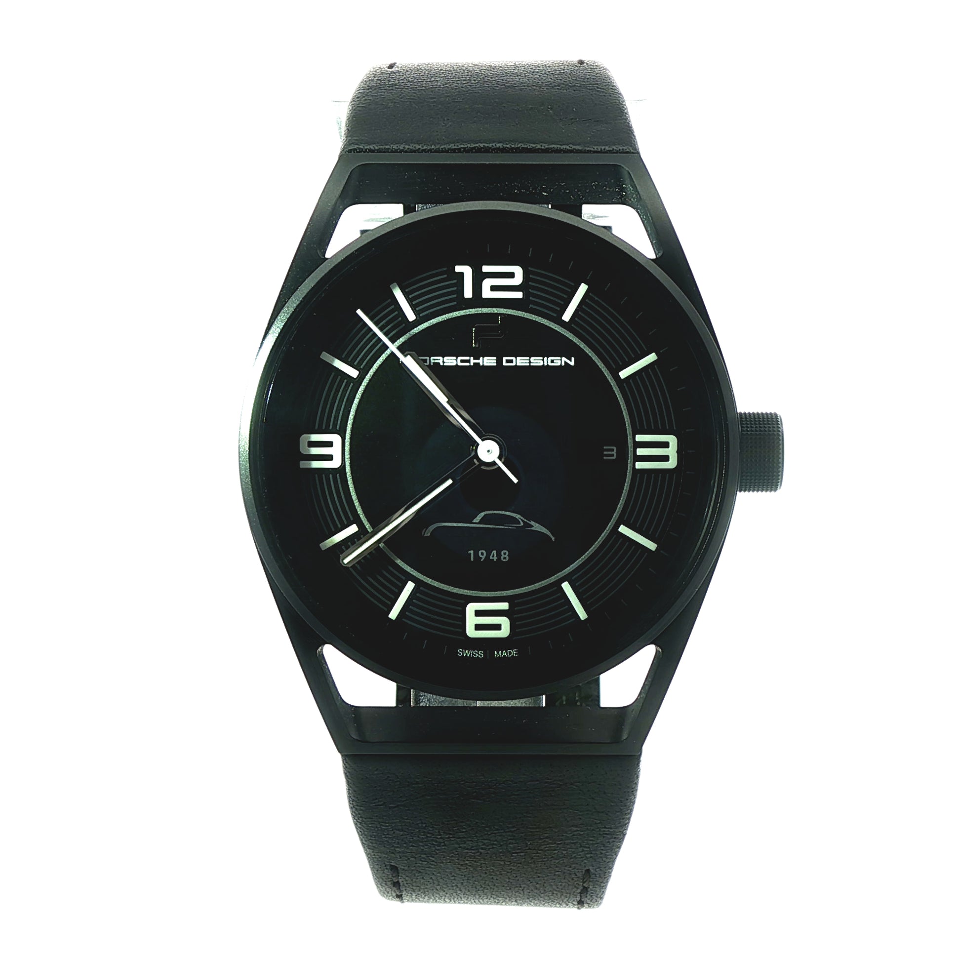 One pre owned black titanium 'Porsche Design' Datetimer 70th Anniversary strap watch. Comprising of a black titanium case. Black quarter Arabic numeral dial and batons. Date window at 3'o'clock. Black leather tapered strap with folding clasp. Self winding movement.