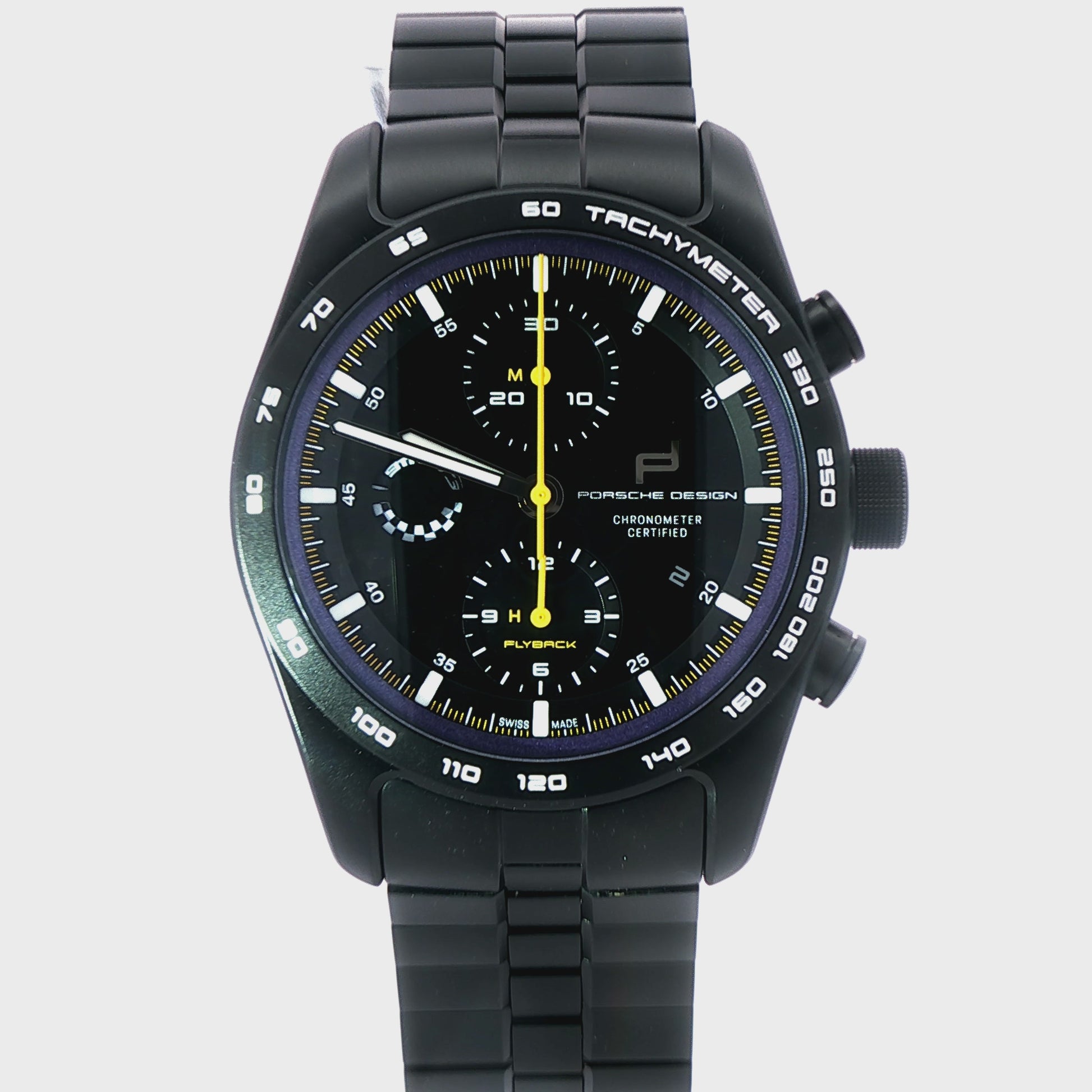 One pre owned titanium 'Porsche Design' chronograph 911 GT3 bracelet watch. Comprising of a black titanium tachymeter. GT hands, yellow with yellow tip. GT dial with yellow details and lilac chapter ring to edge of dial. Sapphire crystal glass and exhibition case-back with GT3 rotor. Self winding chronograph flyback movement.