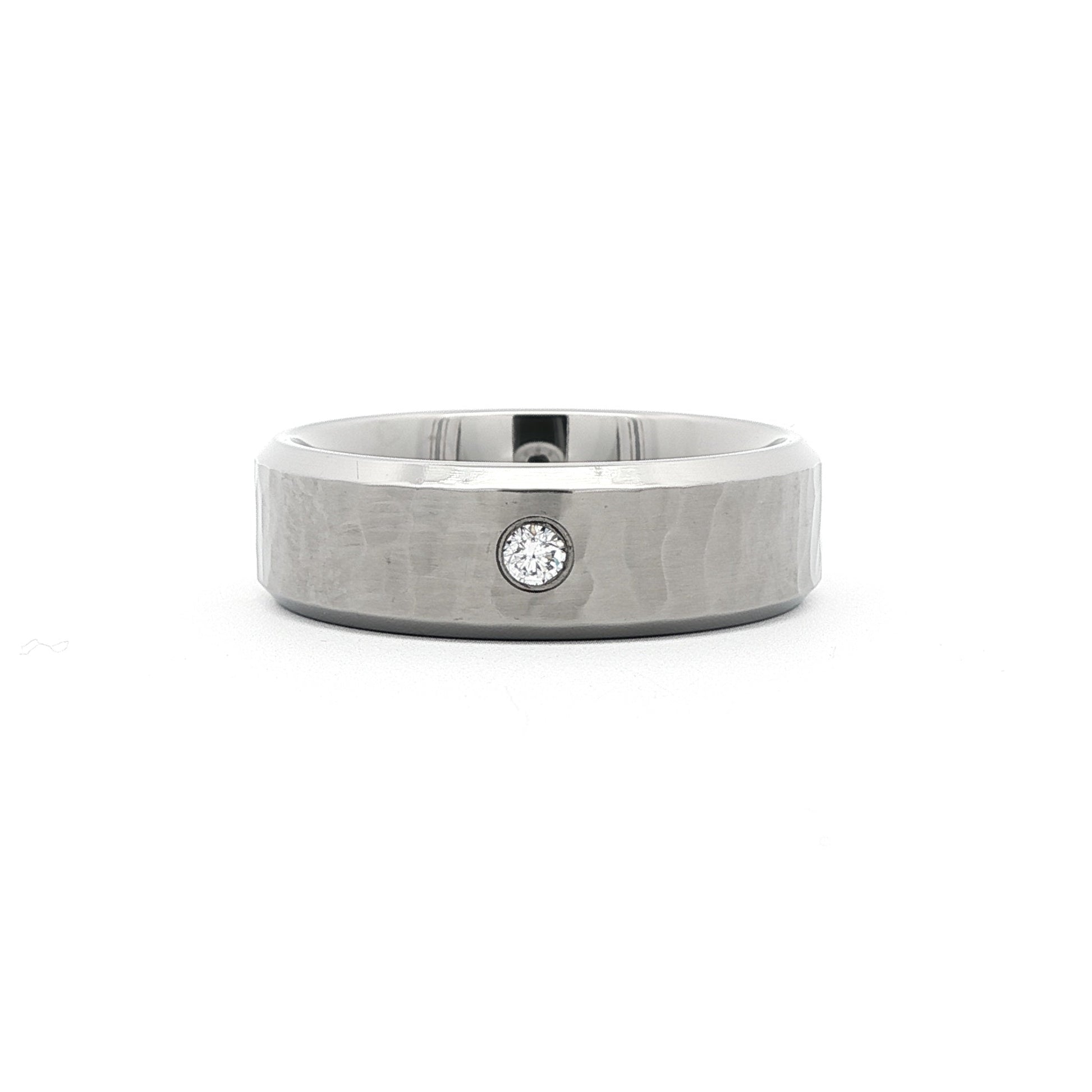 One satin & polish finish flat court hammered effect titanium band with beveled polished edges and a diamond set centre.